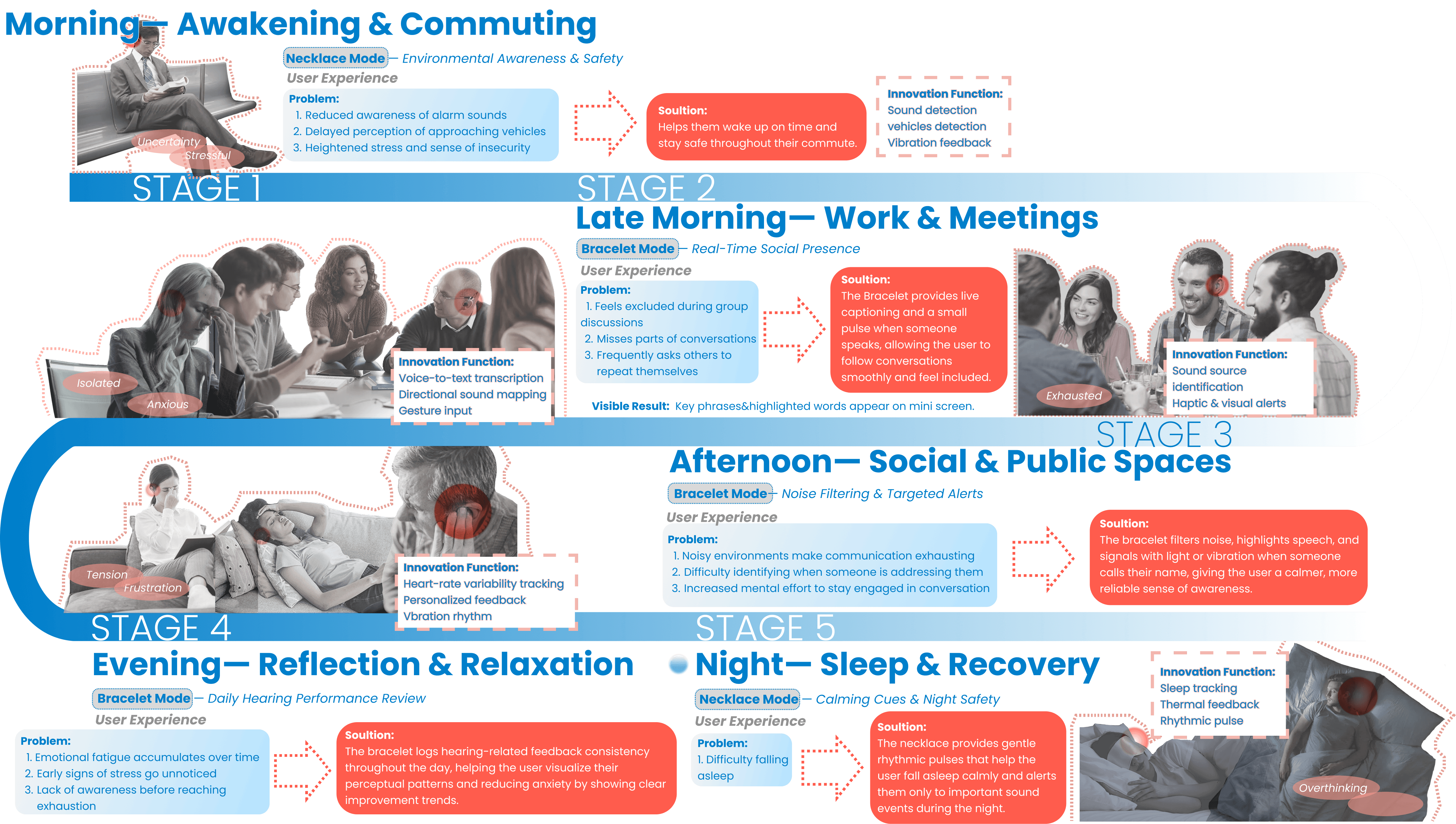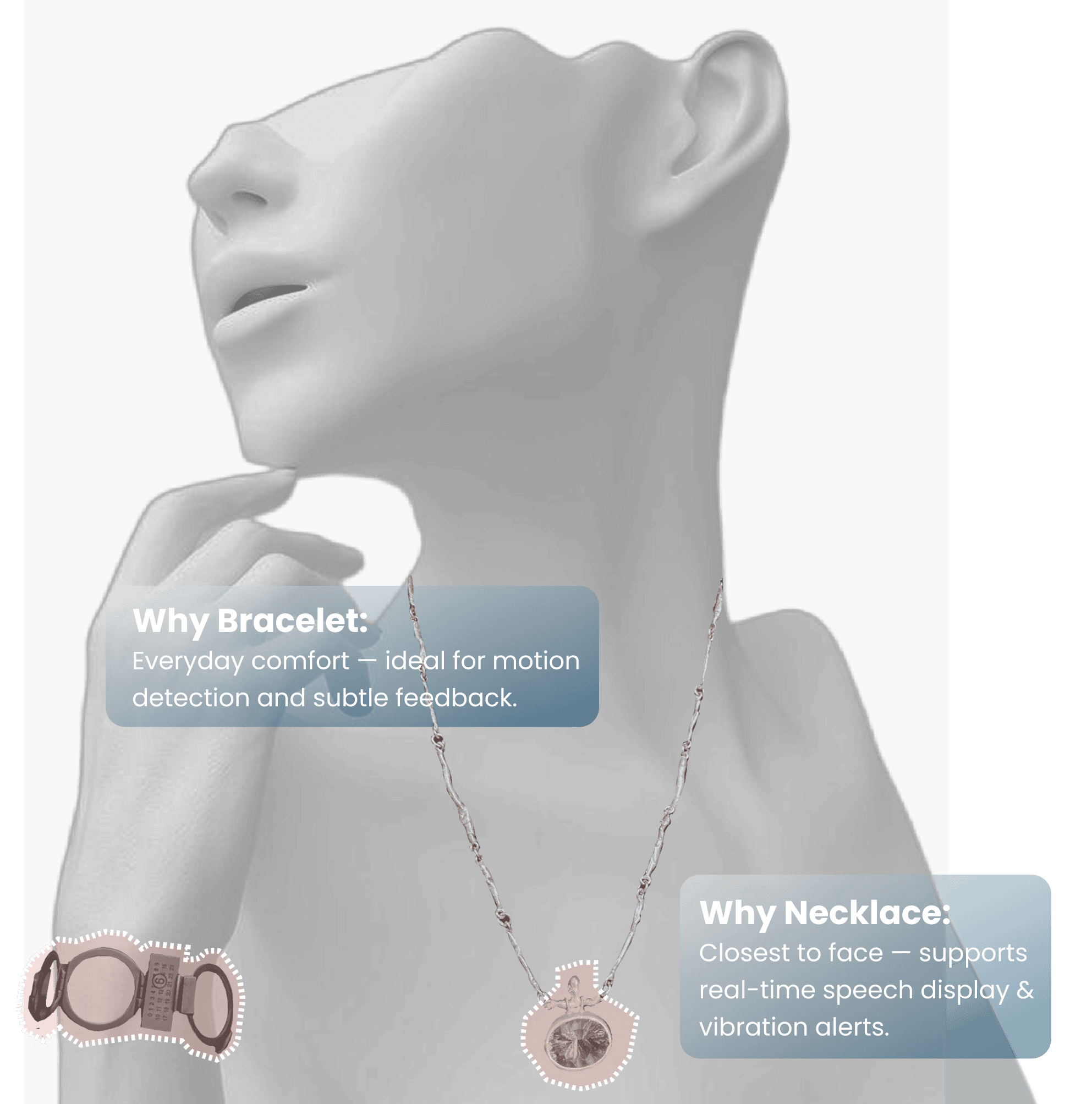 AURAKEY is a jewelry-like multisensory wearable that translates sound into light, vibration, and subtle visual cues. It adapts across necklace and bracelet modes to support awareness, communication, and emotional calm throughout the day.