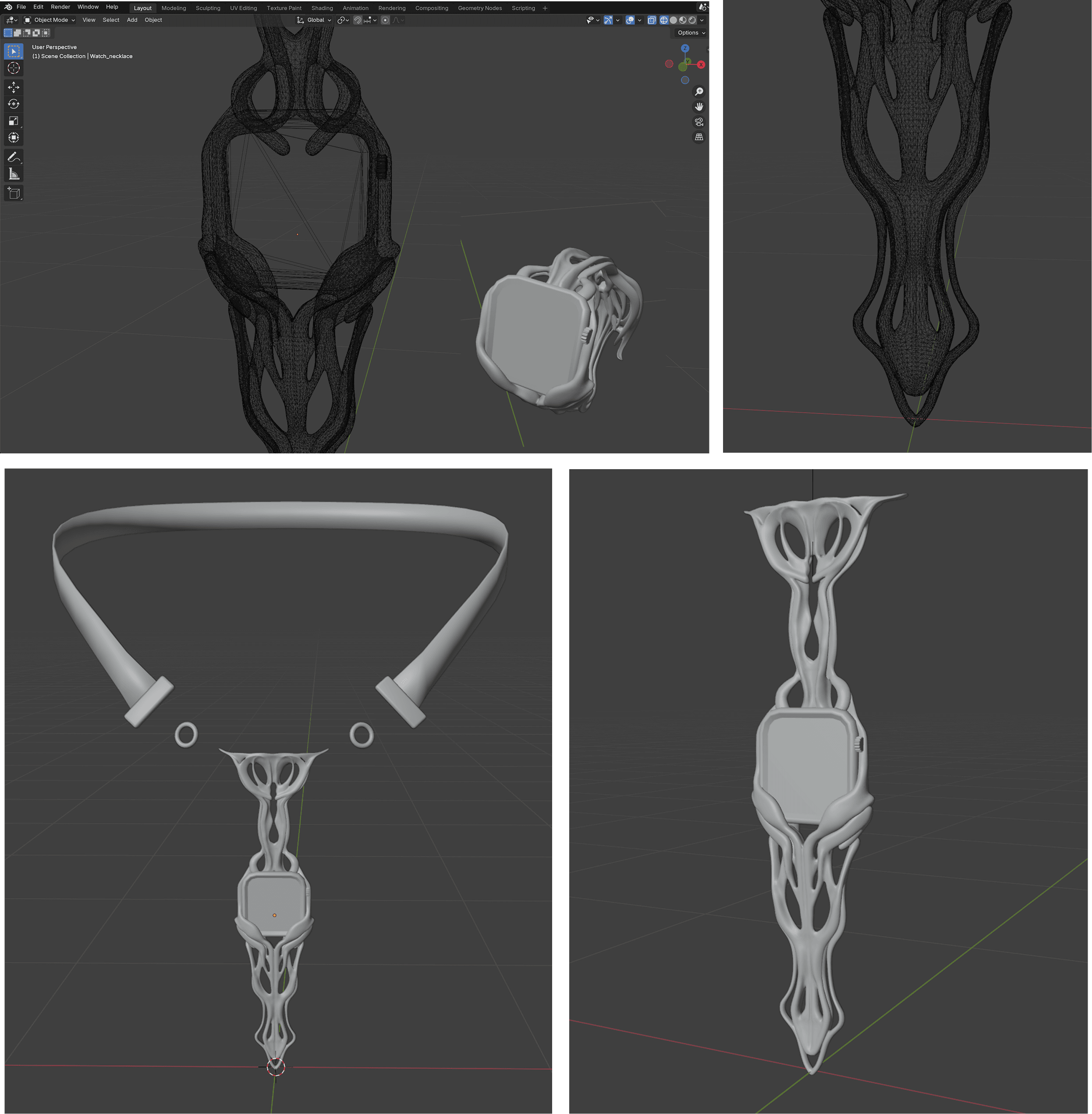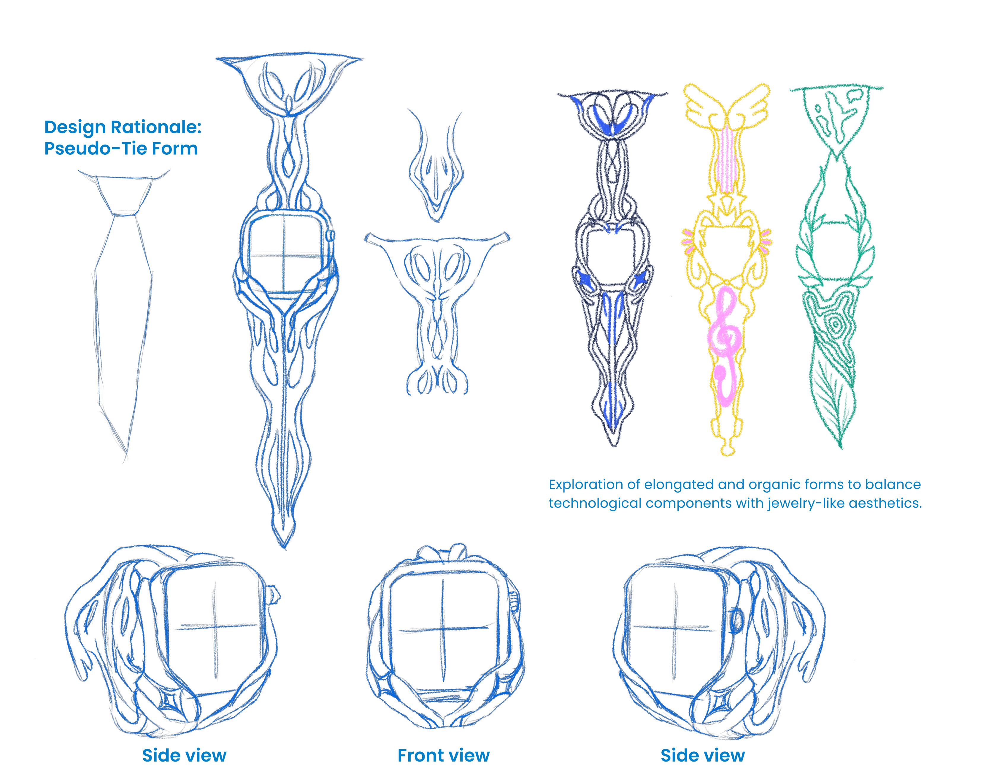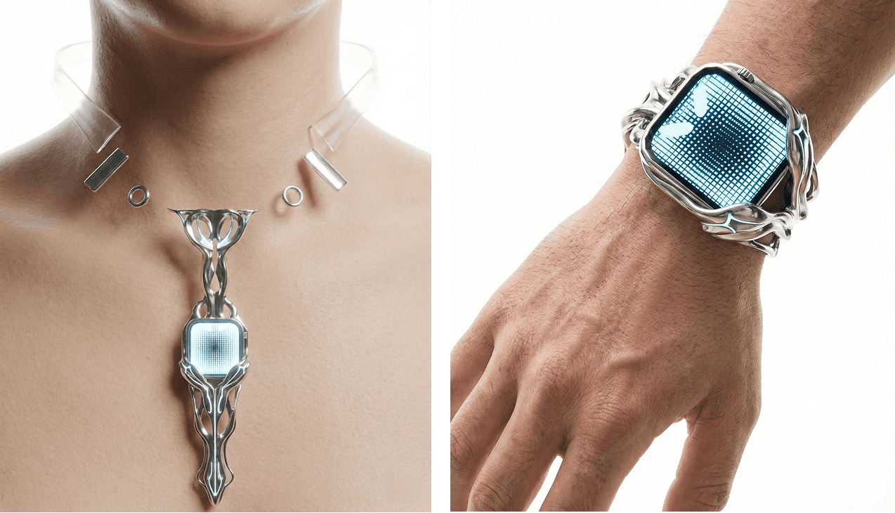 These sketches explore how a wearable device can visually disappear into jewelry-like forms, while still maintaining clarity, comfort, and interaction logic. The focus is on validating proportion, structure, and wearability before digital modeling.