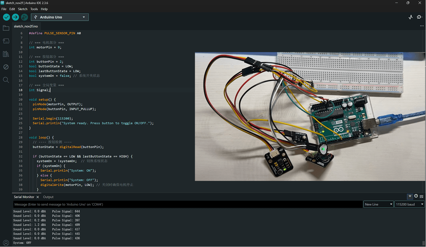 To verify whether the wearable assistive-hearing device can achieve the core interaction loop of “sense → interpret → respond → adapt”, I conducted a series of hardware tests. Each module corresponds to a potential functional component of the device: environmental sensing, physiological monitoring, user input, and haptic feedback.