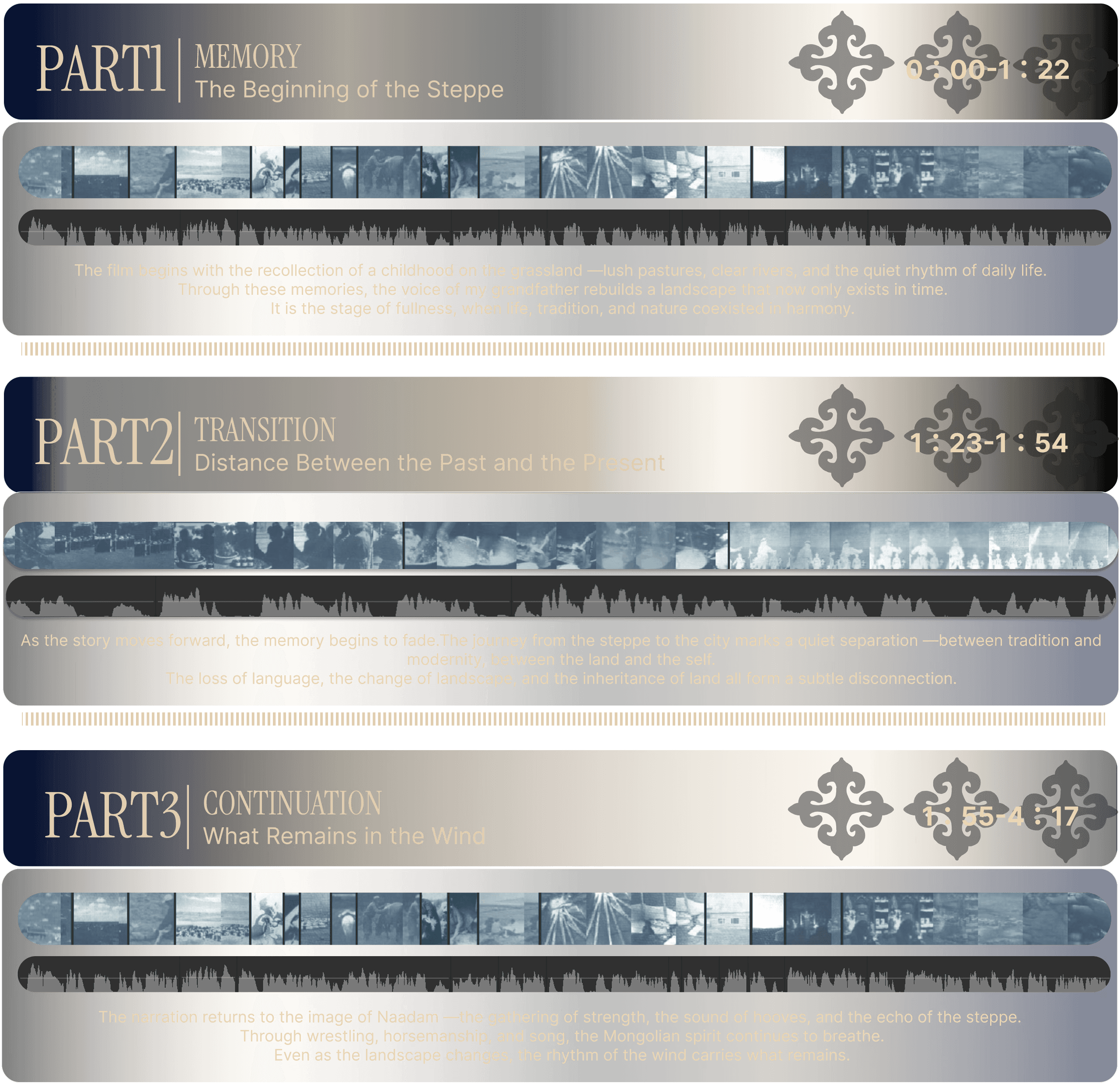 This project investigates the transformation of Mongolian nomadic culture under the forces of urbanization and modernization. Through experimental video and sound-based storytelling centered on personal interviews, it explores how cultural identity is remembered, reshaped, and passed down across generations. The work acts as a time capsule and a reflective space, capturing both continuity and change within Mongolian heritage.
