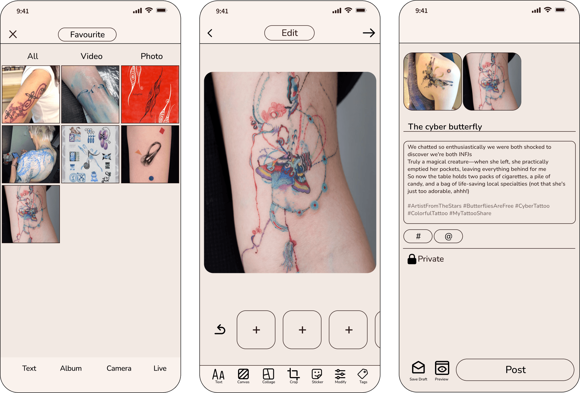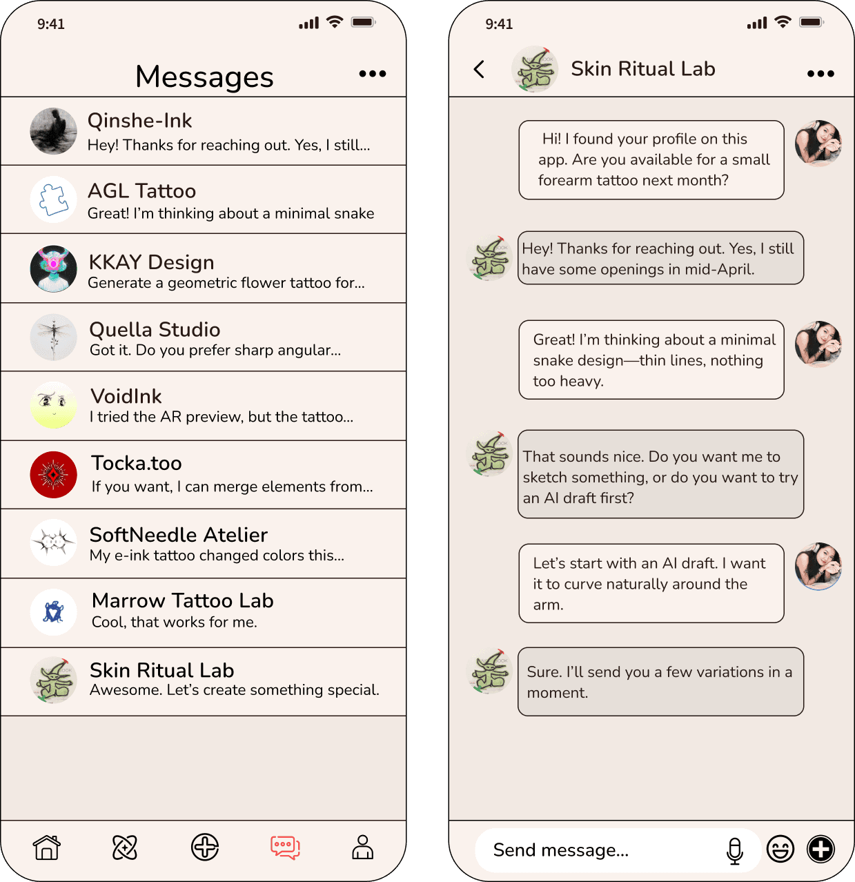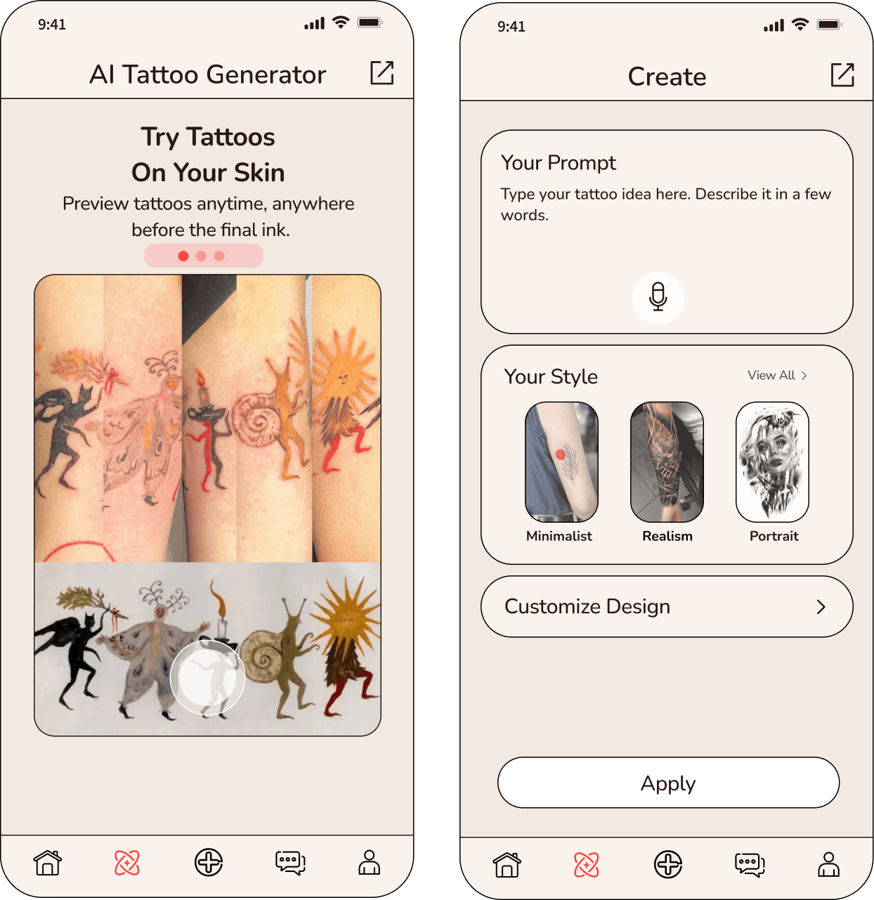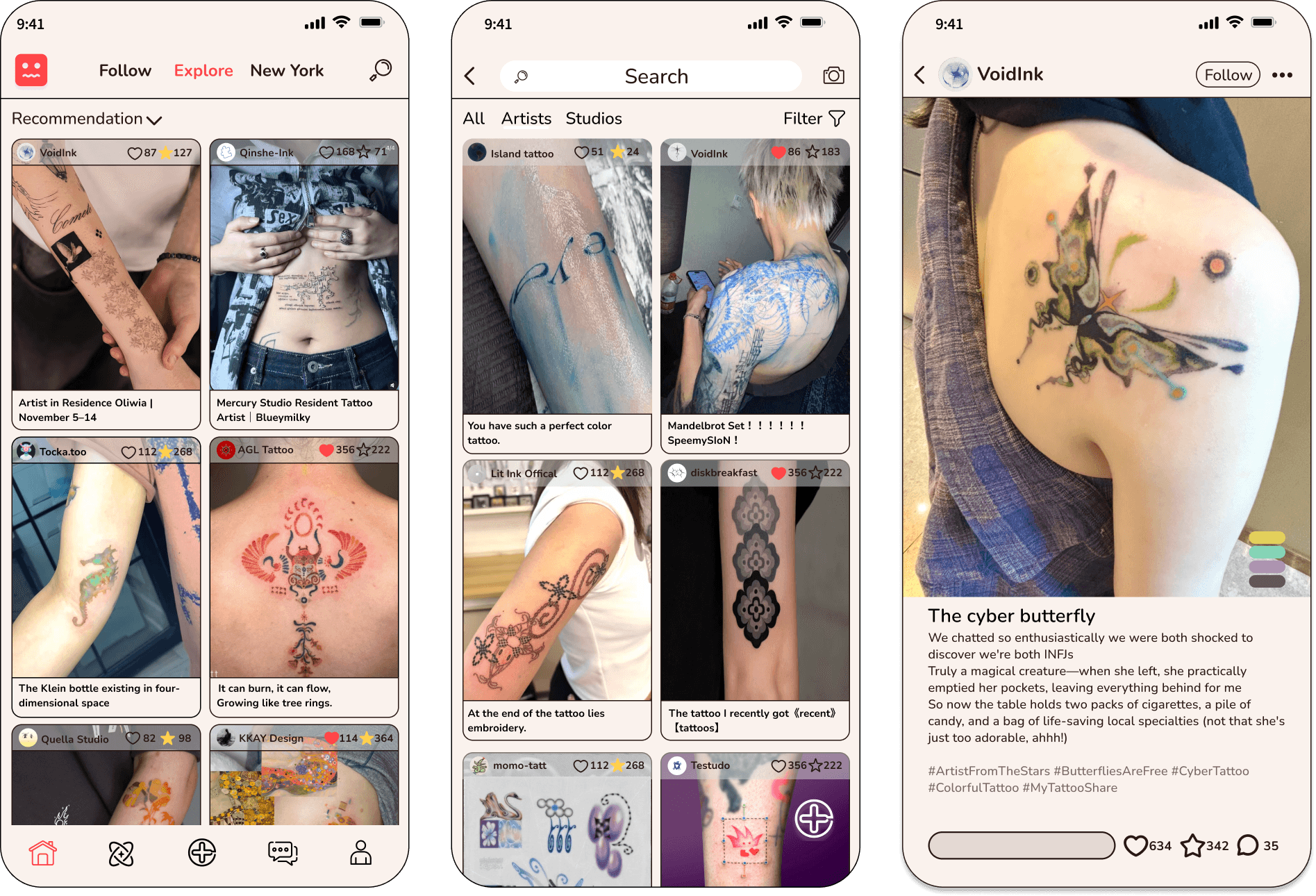 Future Ink is a body-interface system that reimagines tattoos as dynamic, emotional, and interactive media. The project integrates a community-based tattoo platform, AI-generated tattoo creation, AR body visualization, and a bio-responsive e-ink wearable that changes with the user’s physical and emotional data. It explores how technology can extend the meaning of tattoos—from fixed symbols on skin to living, adaptive interfaces for expression, comfort, and identity.